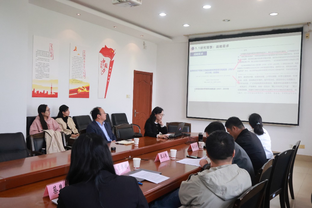 随后,由《面向数智时代的江苏中小学生科学素养评测体系构建与实证研究》课题负责人王靖教授介绍了该课题的研究背景、内容、思路与预期成果。点评阶段,评议专家经提问和讨论一致认为该课题具有较高的研究价值,并给出了进一步的研究建议。王小根教授对评价指标来源和评测实证步骤给出了相关意见。屈廖健教授则强调了对评价所涉及的地区性差异的考量。