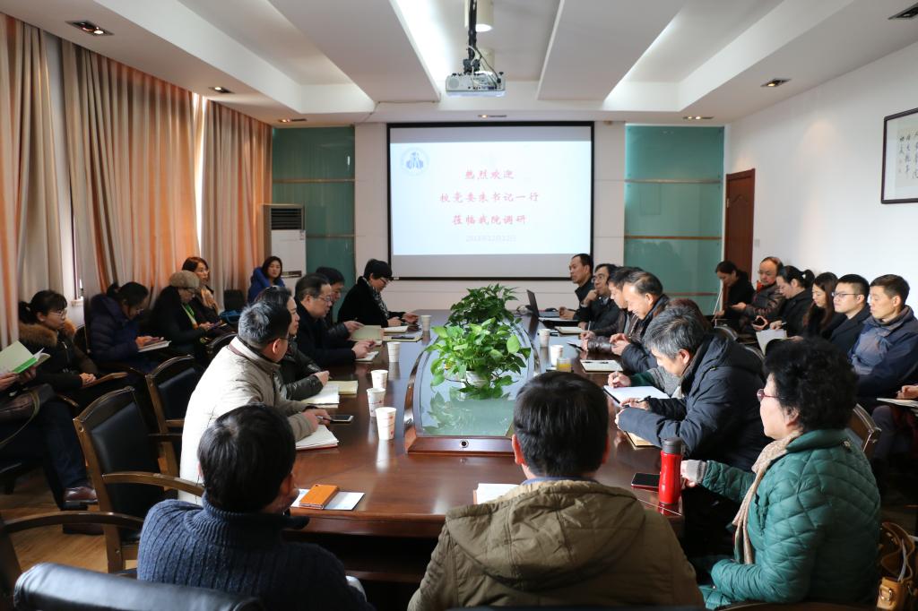 12月12日下午,校党委书记朱庆葆携社科处人事处和研究生院等职能部门负责人一行到太阳成tyc234cc调研。太阳成tyc234cc领导班子成员、各部门主任、教工党支部书记以及部分教师代表等二十余人参加会议。会议由太阳成tyc234cc党委书记沈贵鹏主持。