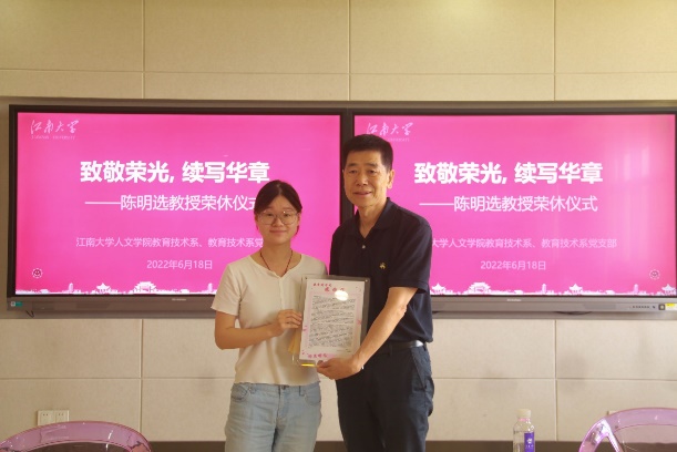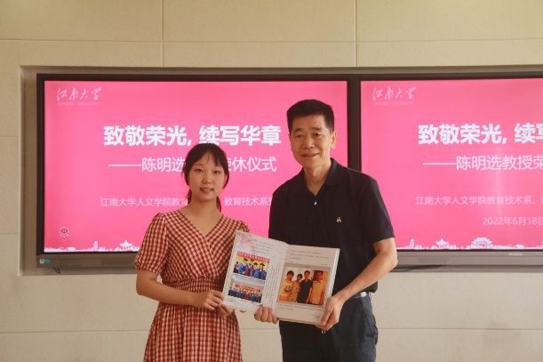在仪式上,姚剑英、杨晖、学生代表谢兴、张乐凡分别向陈明选教授赠送鲜花、纪念册和感谢信,为其在专业发展、人才培养做出的辛苦努力和突出贡献表达感激和谢意。
