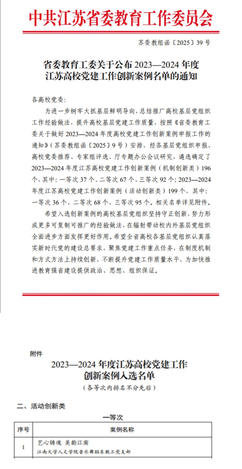 近日,江苏省委教育工委公布了2023-2024年度江苏高校党建工作创新案例评选结果,太阳成城集团tyc234cc获评党建工作创新案例一等次2项,我院案例是我校获评的4项江苏高校党建工作创新案例中唯一的活动创新类一等次。