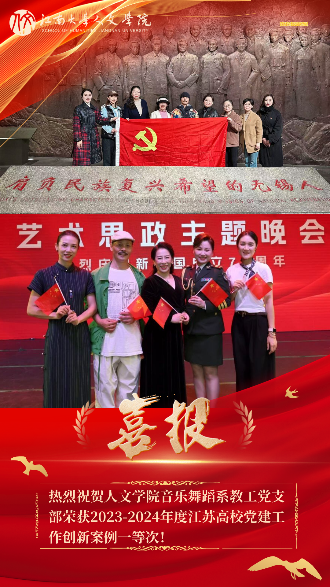 我院紧扣新时代美育要求,着力打造“党建+美育”工作品牌。音乐舞蹈系教工党支部将支部建设与艺术实践结合,通过舞台创作展演、江南文化传承、通识课堂浸润、跨界文化出圈等多元形式,开展《艺心铸魂•美韵江南》主题党日活动,贯通“价值引领-艺术实践-文化传播”全链条,形成党建引领美育提质、美育赋能党建增效的双向融合新范式,系统构建了具有江南特色的美育育人体系。