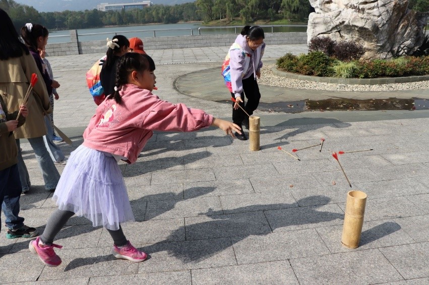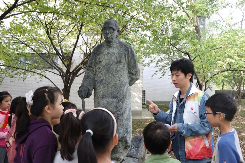 本次活动分为“秋声诗语”和“漫步奇遇”两个部分。“秋声诗语”部分通过“识秋语”、“寻秋色”、“赏秋韵”、“品秋意”、“编秋景”等环节,带领“江小娃”们在游戏、诗歌、国画、手工中领略秋天的魅力。“漫步奇遇”环节,学生党员志愿者带领小朋友们们走向户外,追寻秋天。钱穆像前,小朋友们瞻仰钱穆先生的雕像,感受先生“于国家民族世道人心,自任以匹夫之有其责”的“士”的精神,传递超越时空的温情与敬意。孔子像前,孩子们在志愿者的带领下温习《论语》中的名篇,并学习“拱手礼”,穿越古今与圣贤对话。小蠡湖边,孩子们通过背诵与“秋天”有关的诗词参与投壶、捶丸的游戏环节,在寓教于乐中学习传承中华优秀传统文化。校史馆中,讲解员向小朋友们介绍了太阳成城集团tyc234cc的办学史,帮助他们体会“笃学尚行,止于至善”的校训。