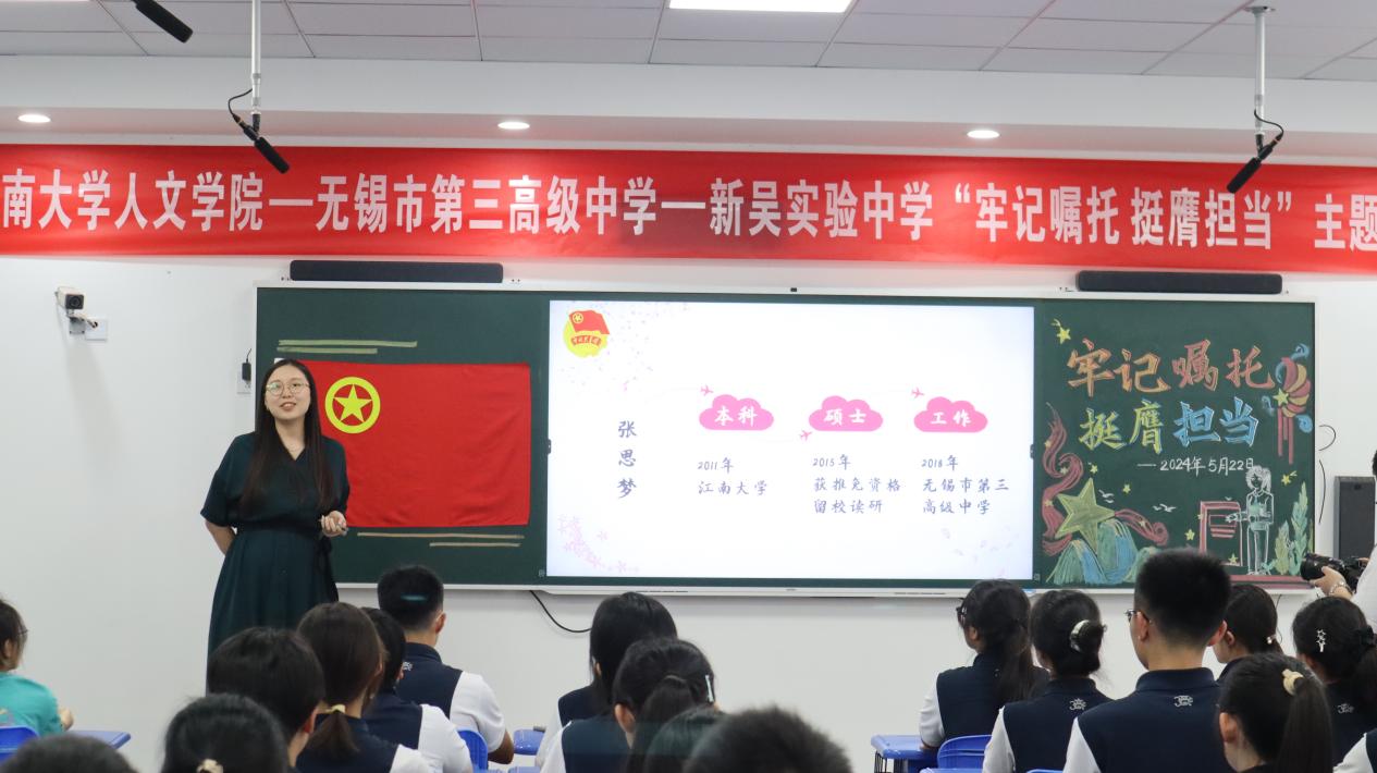 为深入学习习近平总书记五四重要寄语精神,近日,太阳成tyc234cc青年马克思主义者培养工程第六届培训班学员赴无锡市第三高级中学参加“牢记嘱托、挺膺担当”主题团日活动,与无锡市第三高级中学、新吴实验中学的60余名团员代表们共同学习习近平总书记五四青年节对全国广大青年寄语精神,畅谈《习近平与大学生朋友们》读书心得,分享成长经历和感悟。