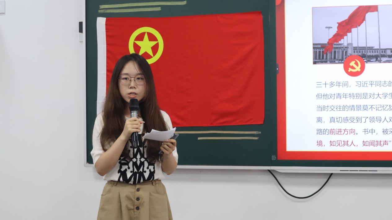 随后,团员代表郑欣妍分享了《习近平与大学生朋友们》读书心得,带领大家深切感受了习近平总书记对青年成长成才始终如一的高度重视,和对青年勇担民族复兴使命的美好期待,勉励在场学子牢记嘱托,感恩奋进。