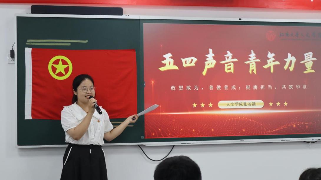 活动由团干部代表张若涵讲授《五四声音,青年力量》主题微团课开始,她带领同学们一起学习习近平总书记五四青年节对全国广大青年寄语精神,讲述黄文秀、陈祥榕、江梦南的先进事迹,勉励大家要“日拱一卒无有尽,功不唐捐终入海”。