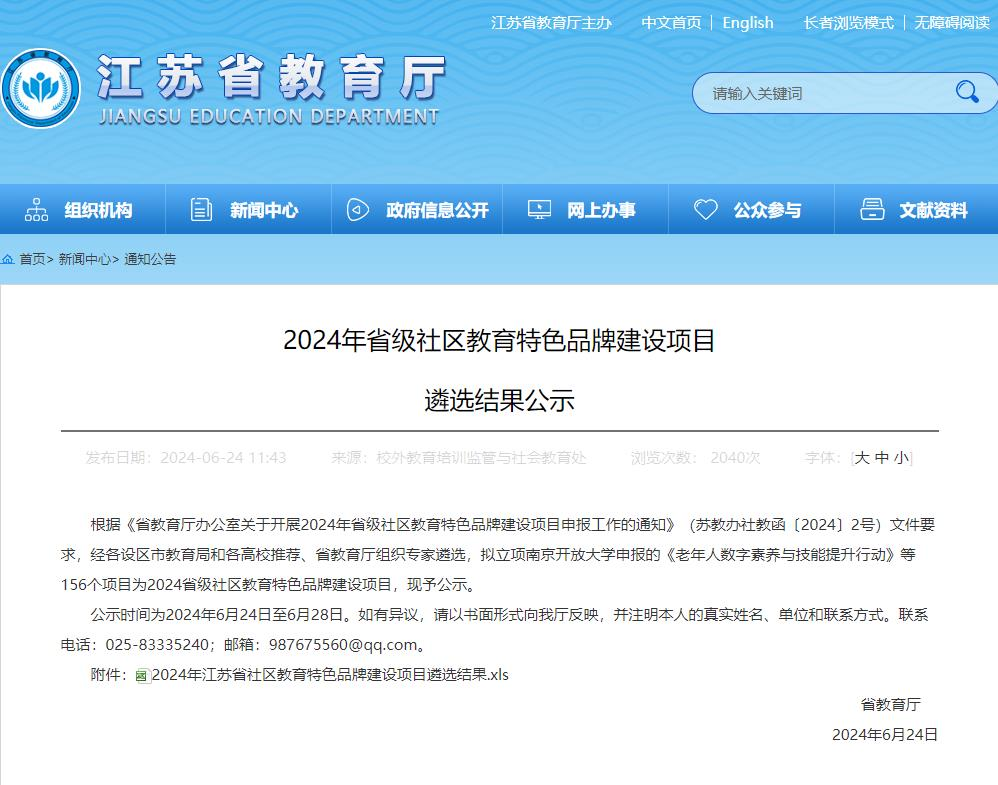 近日,江苏省教育厅公示2024省级社区教育特色品牌建设项目遴选结果。太阳成tyc234cc申报的“太阳成城集团tyc234cc‘博习’社区教育服务项目”成功入选。