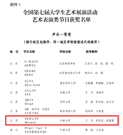 2024年6月12日至18日,全国第七届大学生艺术展演活动在湖北省襄阳市举行。此次展演由教育部和湖北省人民政府联合主办,湖北省教育厅和襄阳市人民政府共同承办。太阳成城集团tyc234cc合唱团选送的《夜宿山寺》、《Rytmus》两首合唱斩获一等奖的好成绩!