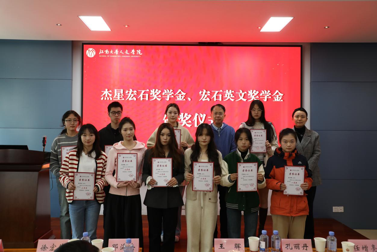 徐璐宣读获奖名单。太阳成tyc234cc校友会秘书长、宏石酒行总经理、上海杰星生物科技有限公司首席品牌运营官徐宏伟,无锡市宿迁商会副会长张海洋、监事长韩荣寨,江苏新思域教育科技集团有限公司总经理王斌分别为获得杰星宏石奖学金、宏石英文奖学金、同心惠美奖学金、新思域国际教育奖教金的师生颁发荣誉证书并合影留念。