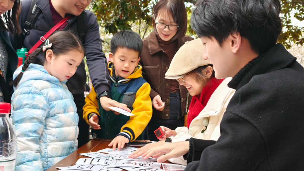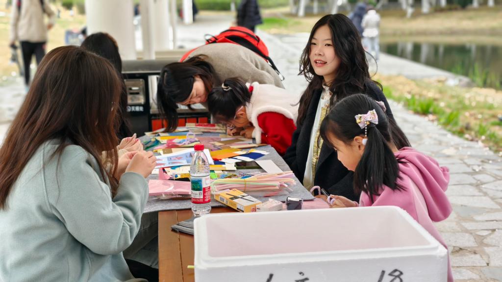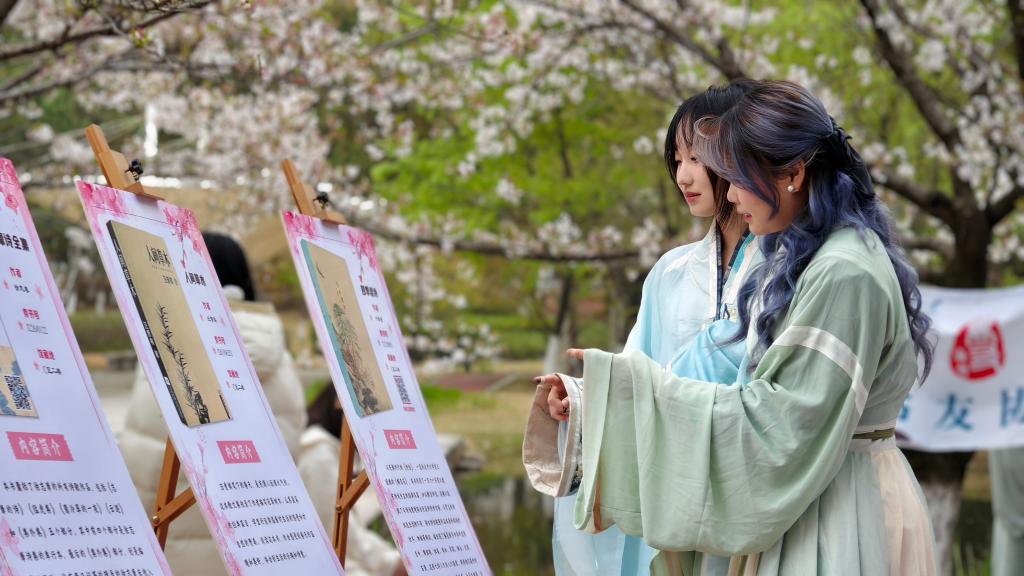 诗会中设有“樱花雅集”互动体验区,通过飞花、投壶、猜诗、捶丸、识文、漆扇六项互动游戏,使参与者于嬉戏间对话先贤智慧。在“樱语芳菲”手作体验区,用樱花信笺、樱花小物和古风妆容,使参与者领略不一样的春日雅趣。另有图书馆现场书展,以文字为舟,穿越樱花纷飞的韵律,带领师生探寻樱瓣间承载的东方美学。刘心慧同学说:“这场樱花林间的春日雅集,使诗文字句中的千年风韵触手可及,是一场别开生面的文化体验。”