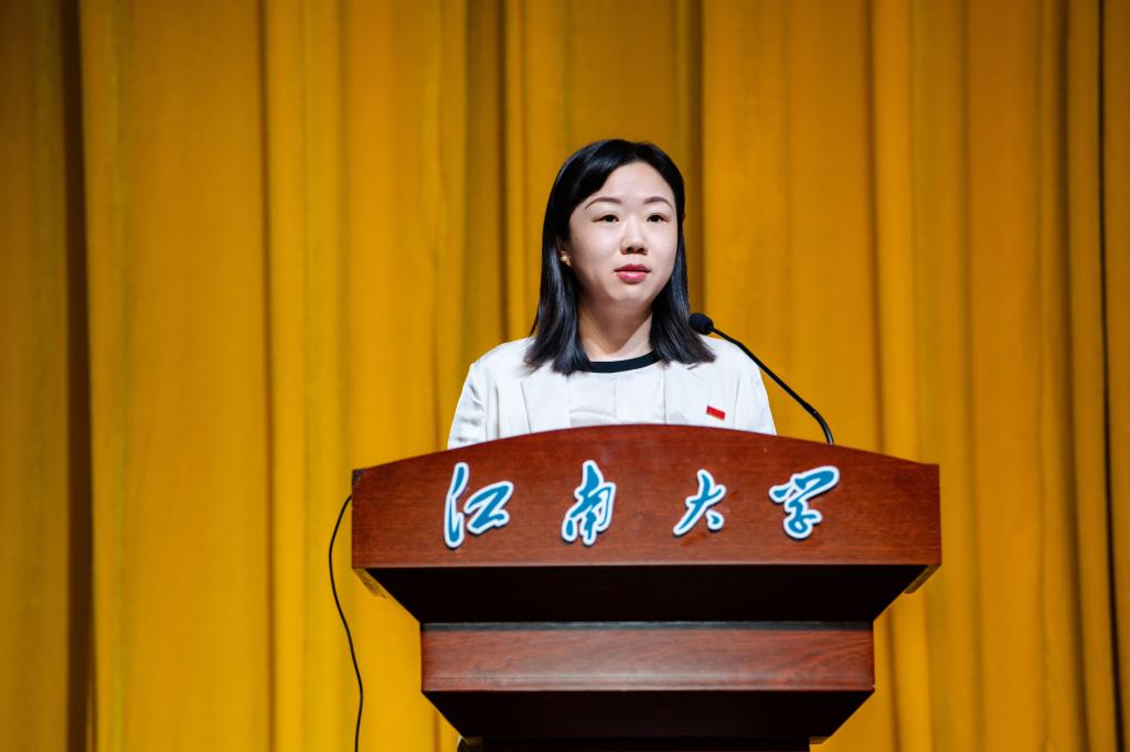 佩戴校徽仪式上,学院领导为新生代表佩戴校徽,希望全体新生能秉持着“笃学尚行,止于至善”的校训精神和“学高为师,身正为范”的人文情怀,奋力谱写“江南人”的崭新荣光。