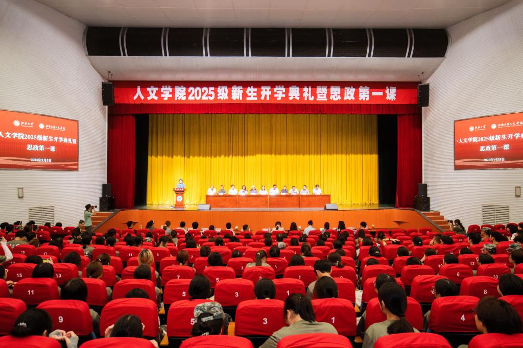 典礼在庄严的国歌声中拉开序幕。王晖代表学院对2025级全体新生表示最真挚的欢迎。她表示,青年大学生正处于人生黄金期,与民族复兴的伟大征程同频共进。她对新生提出三点期望:一要心怀“国之大者”,锚定成长坐标。希望新生树立“国之所需,吾之所向”的信念,将个人成长与国家战略、民族复兴紧密相连,在未来的学习中主动关注社会需求、思考文化责任,做有家国情怀、能担时代使命的“大写的人”;二要深耕“人文沃土”,练就过硬本领。寄语新生珍惜学院提供的优质资源,在课堂内外主动探索,既要读“有字之书”夯实理论功底,更要通过实践将知识转化为服务社会的能力,以扎实的专业本领成为推动社会进步的“实干者”;三要肩负“青年担当”,绽放青春风采。鼓励新生在实践的大舞台上读好“无字之书”,以青春之行服务社会,以专业所学贡献国家,在书本中涵养“青年气质”,在实践中砥砺“青年担当”。