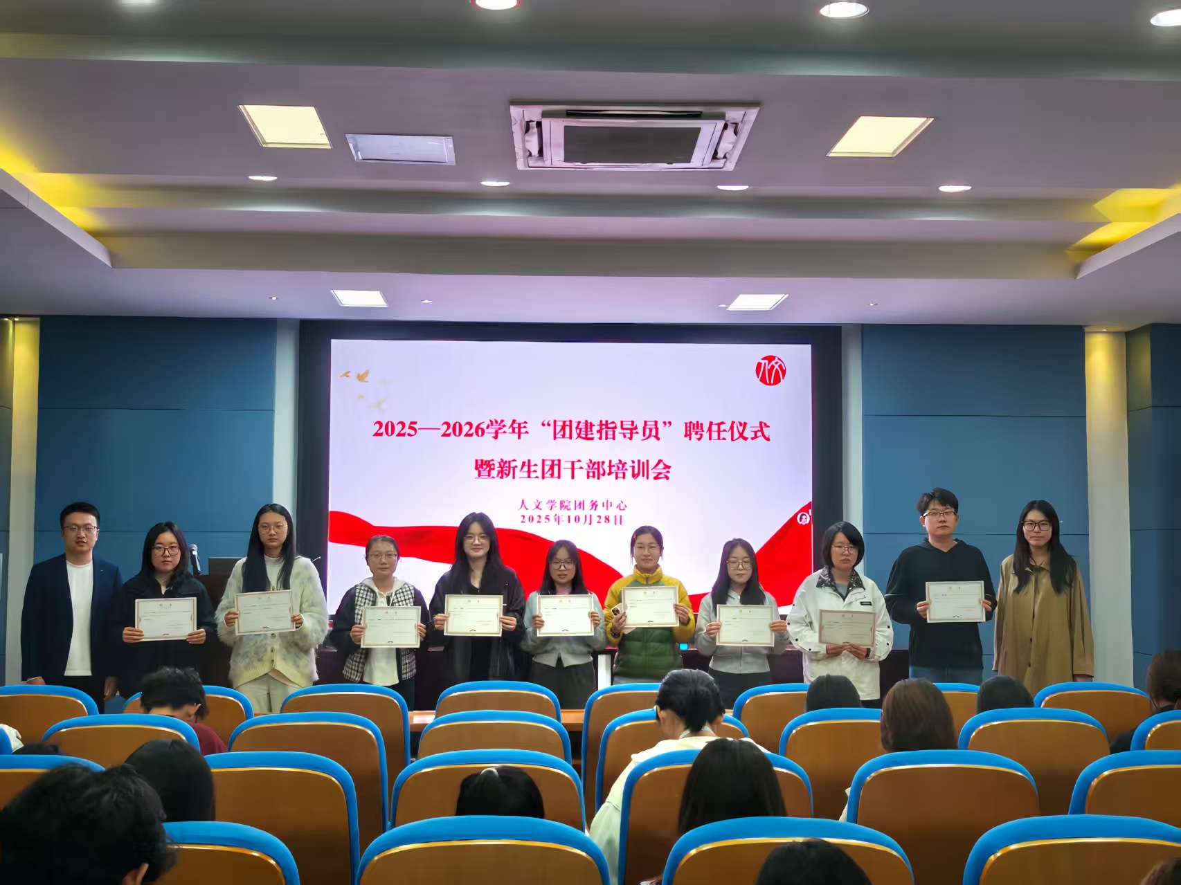 为进一步夯实基层团组织建设,提升新生班团干部的理论素养与实务能力,10月29日晚,太阳成tyc234cc在田楼209会议室举行了2025-2026学年团建指导员聘任仪式暨新生班团干部培训会。太阳成tyc234cc学工办主任、分团委书记邓昌海,2025级本科生辅导员刘畅,学生团务中心负责人,优秀团支书代表,团建指导员,以及2025级新生班团干部等60余人出席本次会议。