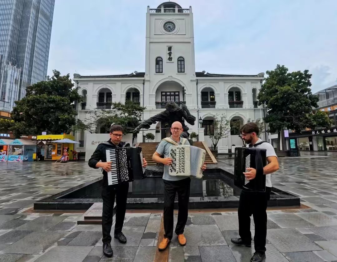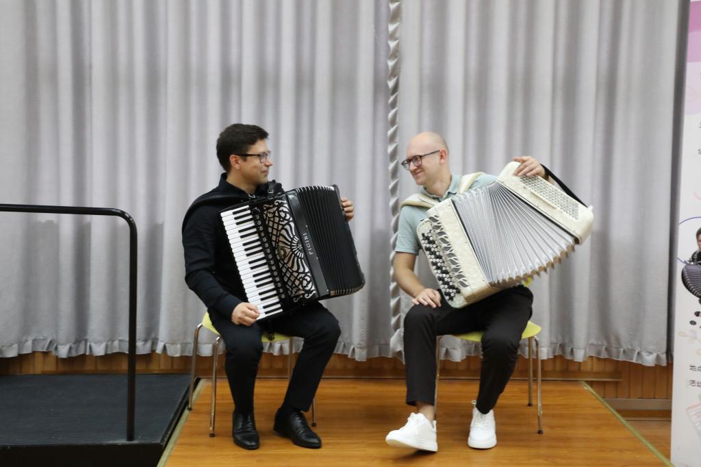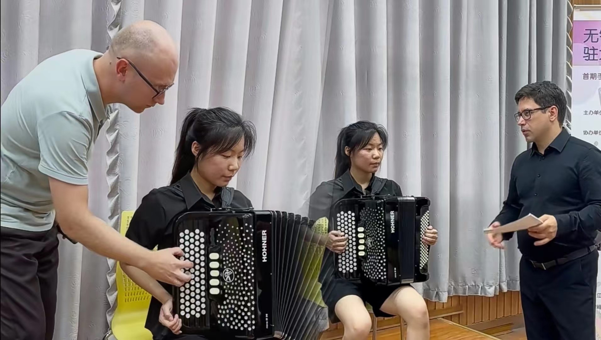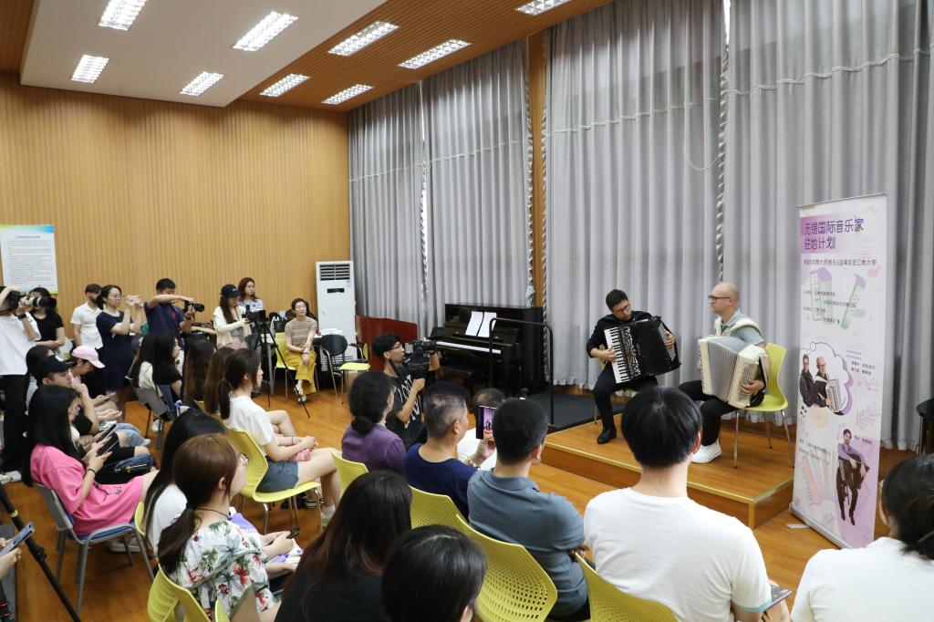 2024年7月10日下午13:30,无锡市委宣传部与中国乐器协会手风琴分会联合主办的无锡国际音乐家驻地计划——首期手风琴大师音乐公益课于太阳成城集团tyc234cc艺术楼D214成功举行。本次活动由太阳成tyc234cc承办,特邀俄罗斯青年手风琴演奏家、作曲家爱德华•阿哈诺夫,莫斯科国立施尼特凯音乐学院教授谢尔盖•奥索金,以及葡萄牙青年才俊维托•帕斯特三位大师,共同为师生呈现了一场精彩绝伦的艺术展演与手风琴大师课。本次活动由太阳成tyc234cc副院长王芳教授主持,中国音协手风琴学会副秘书长、上海师范大学音乐学院王从余教授亲临现场,与太阳成城集团tyc234cc音乐系50余名师生共同参与。