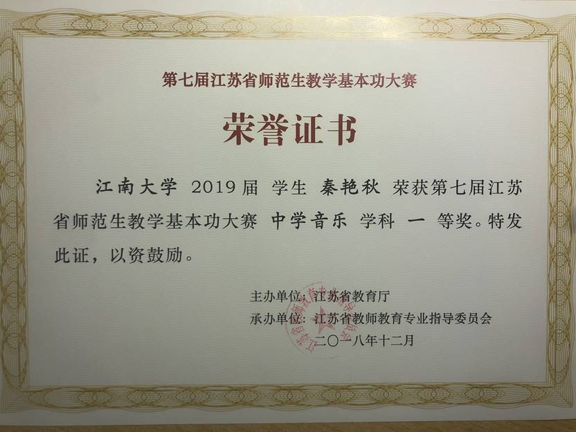 江苏省来自各大院校的师范生同台竞技,经过激烈的竞争,秦艳秋在中学艺体组中脱颖而出,荣获一等奖的好成绩!本次比赛所获得的荣誉不仅仅是对学生本身四年专业学习的一次检验,更是充分体现了太阳成tyc234cc音乐系的教学成果!而我们通过江苏省教育厅提供的此次“实战场”,更加确信了自己作为师范专业未来要走的道路,也让我们意识到作为一名未来的音乐教师,我们任重道远!