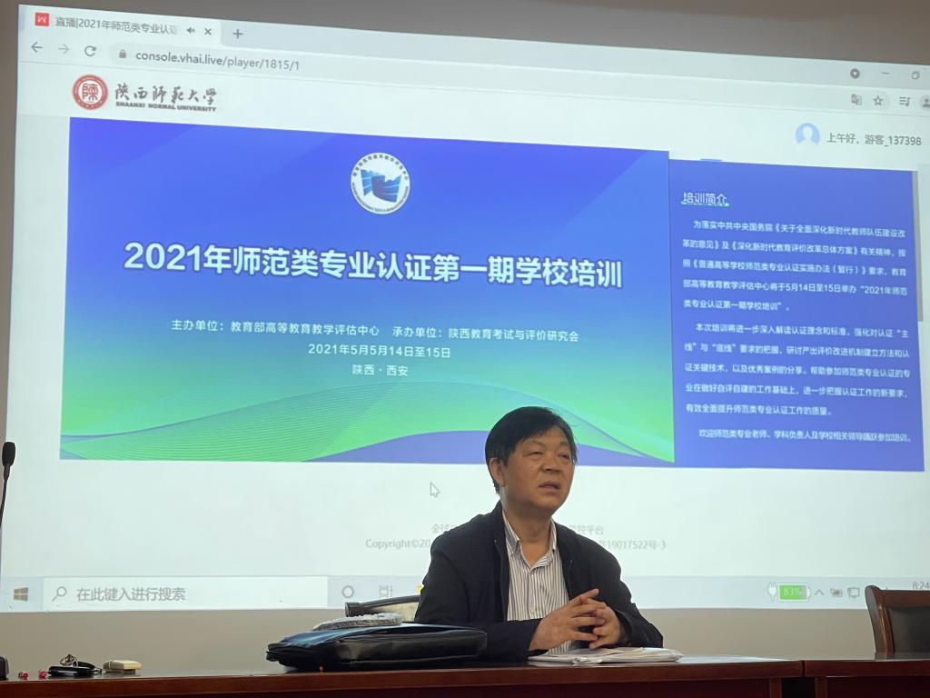 2021年5月14日至15日,太阳成tyc234cc在田家炳楼209会议室组织全院师范专业相关教师在线参加了“2021年师范类专业认证第一期学校培训”。此次培训由教育部高等教育教学评估中心举办、陕西师范大学承办,是十四五期间教育部组织的首次师范类专业认证培训。