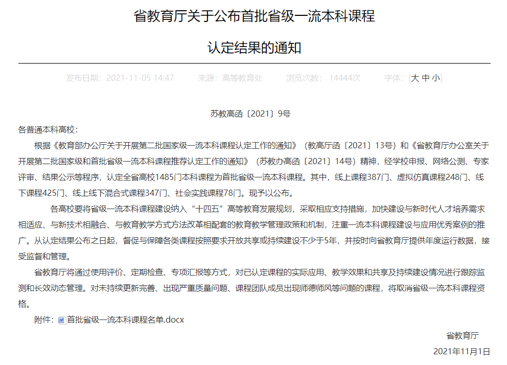 课程是人才培养的核心要素,课程质量直接决定人才培养质量。《教育部关于一流本科课程建设的实施意见》(教高〔2019〕8号)指出:“建设适应新时代要求的一流本科课程,让课程优起来、教师强起来、学生忙起来、管理严起来、效果实起来,形成中国特色、世界水平的一流本科课程体系”,“破除课程千校一面,杜绝必修课因人设课,淘汰‘水课’,立起课程建设新标杆”。