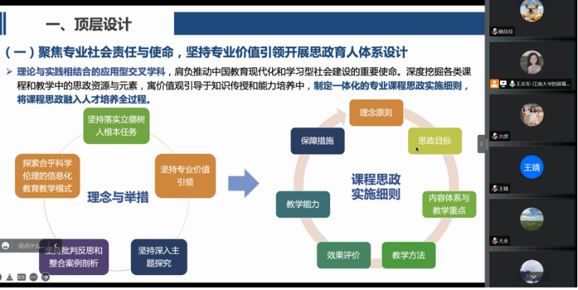 首先,王志军主任详细完整地介绍了教育技术学专业课程思政实施细则以及总体设计。随后,教育技术系课程思政示范课立项的几位课程负责人马志强教授、王靖副教授、蔡慧英副教授、刘向永副教授、张红英老师以及王志军教授逐次从课程简介、理念目标、课程创新、考评成效、说课案例等方面对各自负责的课程进行了详细的介绍。
