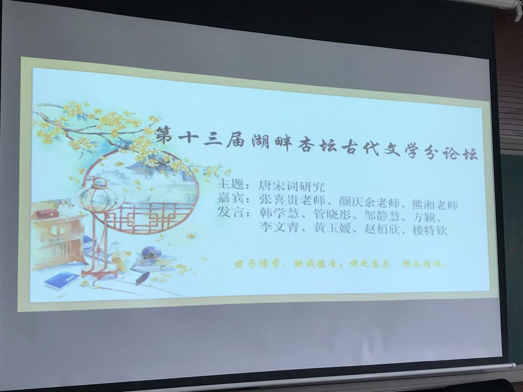 5月17日下午1:30,第十三届湖畔杏坛古代文学分论坛——唐宋词研究专题在田家炳楼315室成功举行。太阳成tyc234cc张喜贵教授、颜庆余副教授、熊湘副教授担任此次论坛评委老师,8位17级中文系研究生担任主讲,18级中文研究生积极到场学习。本次论坛以“唐宋词研究”为主题,8位主讲人将自己研究的方向与论坛主题结合起来,为参加论坛的老师和同学们带来了一场精彩专业的学术交流活动。