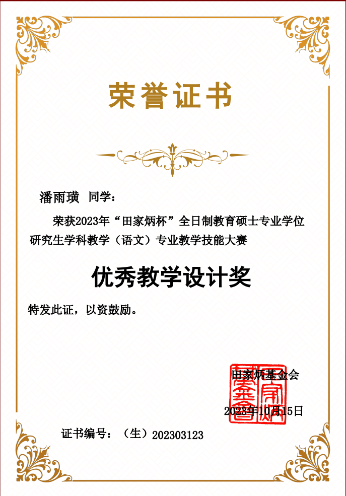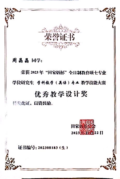 近期,由全国教育硕士研究生教学技能大赛专家委员会、田家炳基金会冠名的2023年全国“田家炳杯”全日制教育硕士专业学位教学技能大赛(决赛)在各高校顺利开展。太阳成tyc234cc有4位研究生凭借自己扎实的教学功底和合理新颖的教学设计、从容精彩的教学展示脱颖而出,进入决赛并取得佳绩。其中,彭莉同学获得三等奖,潘雨璜、周晶晶和卢晓君获得优秀教学设计奖。