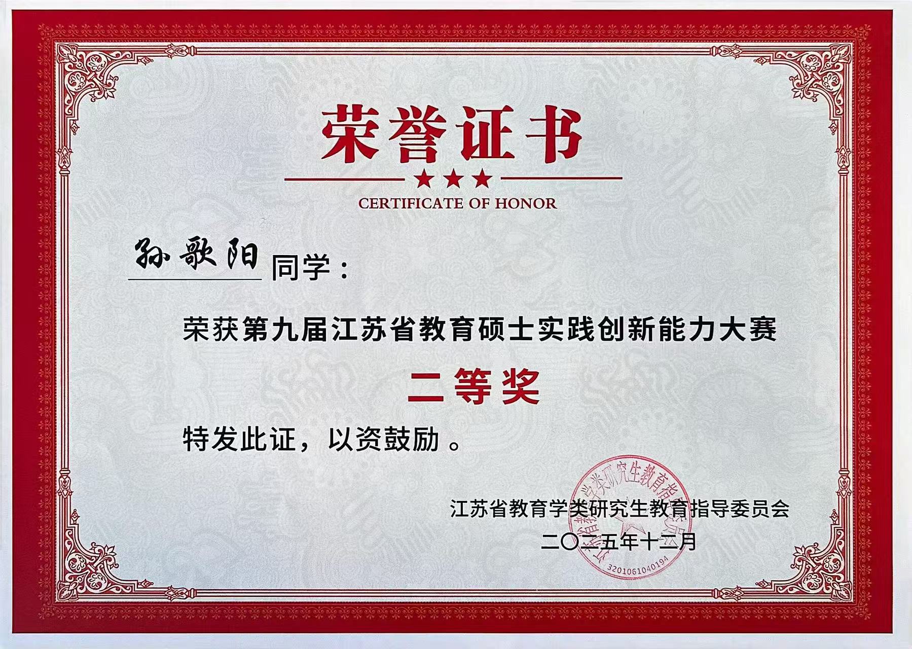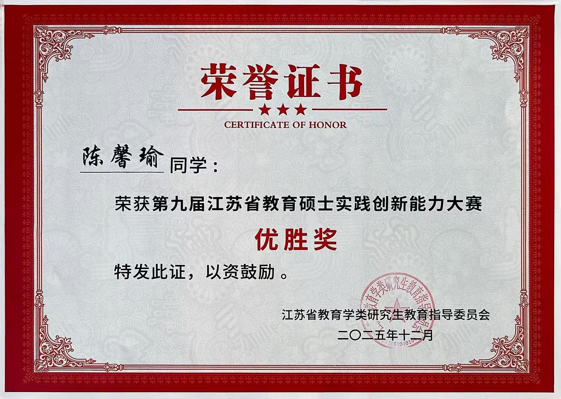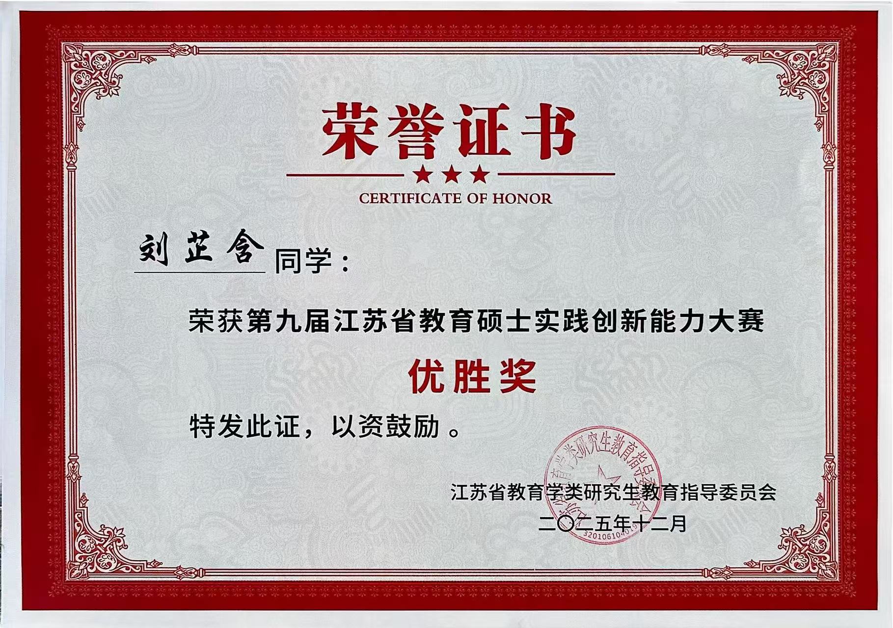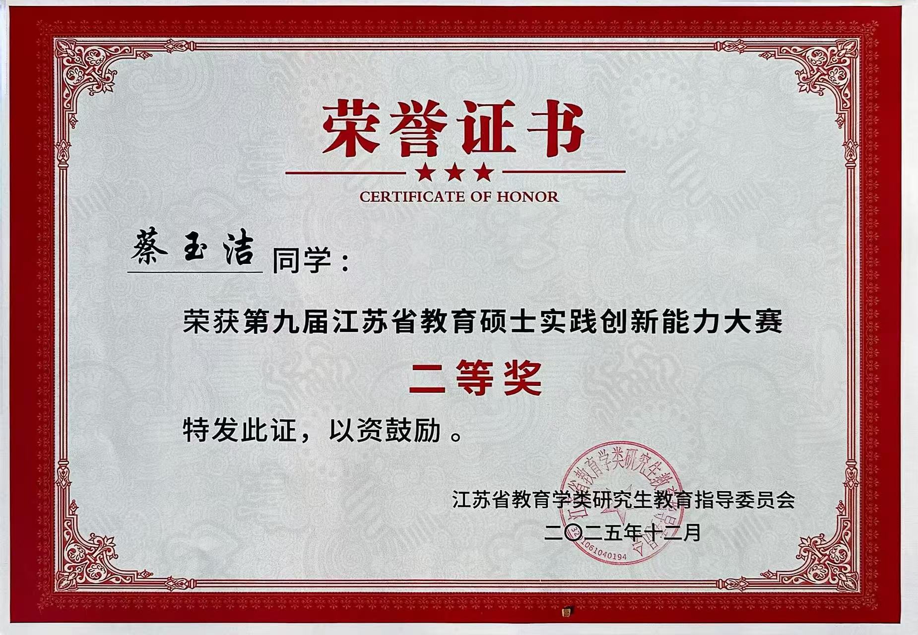 2025年12月5日-7日,由江苏省教育学类研究生教育指导委员会主办,南通大学承办的“第九届江苏省教育硕士实践创新能力大赛”在南通大学举行。我校研究生荣获二等奖2项,优胜奖3项。
