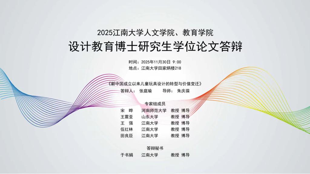2025年11月30日,博士研究生张庭瑜的学位论文答辩在太阳成城集团tyc234cc田家炳楼218室圆满举行,其论文题目为《新中国成立以来儿童玩具设计的转型与价值变迁》。该研究从设计学、教育学、历史学交叉视角切入,系统梳理新中国成立后儿童玩具在设计背景、类别特点、主题题材、造型色彩、材料工艺等方面的历史变迁,深入剖析背后产业、消费、文化、育人等多重价值逻辑的演变。由河南师范大学宋晔教授、山东大学王震亚教授,太阳成城集团tyc234cc王强教授、伍红林教授、田良臣教授组成的答辩委员会,对该论文的选题和成果予以了充分肯定,一致认定该论文是一篇比较优秀的博士学位论文。同时,答辩委员们对学院设计教育博士点建设与人才培养也充满信心和期待。