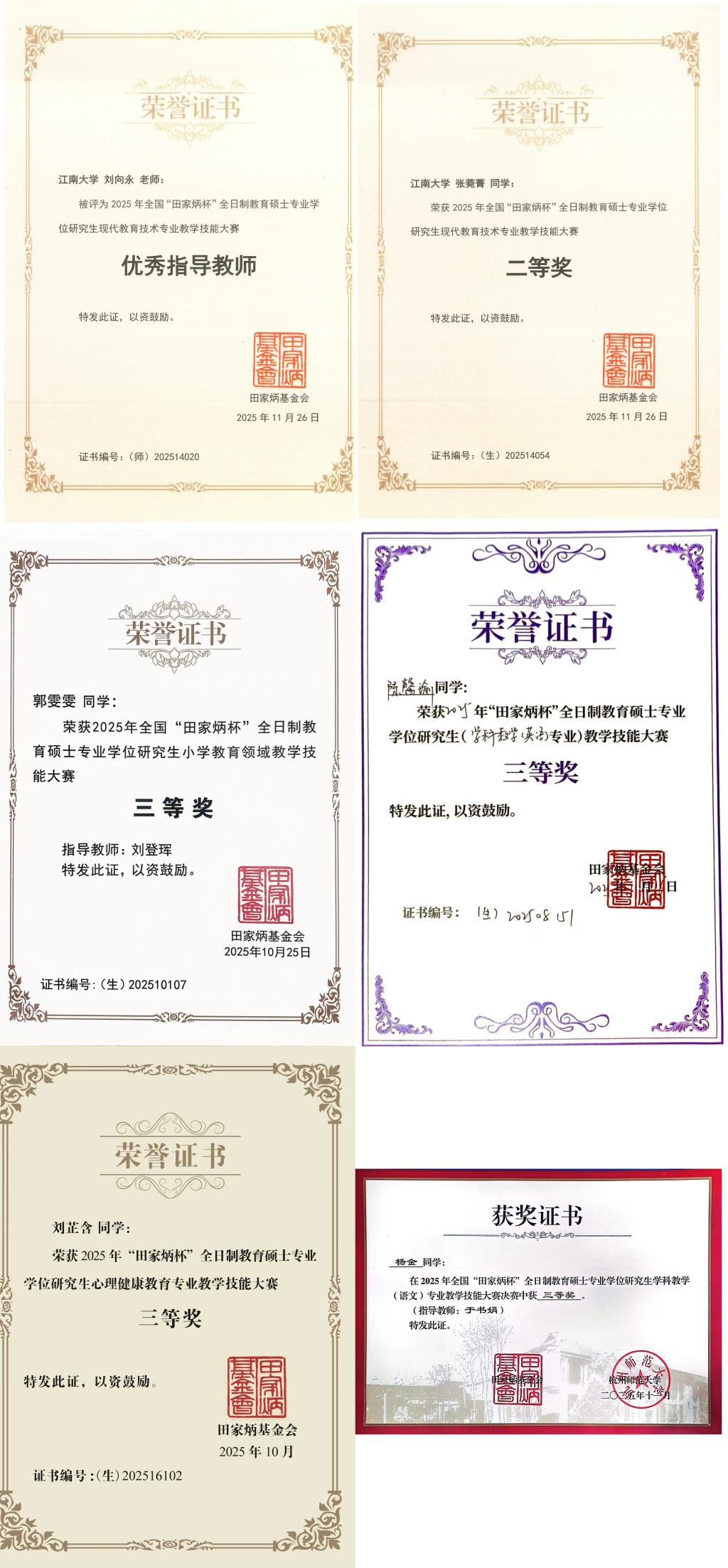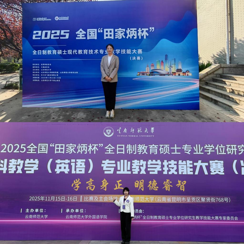 近期,由全国教育硕士研究生教学技能大赛专家委员会、田家炳基金会冠名的2025年全国“田家炳杯”全日制教育硕士专业学位教学技能大赛(决赛)在各高校顺利开展。太阳成tyc234cc有5位研究生凭借自己扎实的教学功底和合理新颖的教学设计、从容精彩的教学展示脱颖而出,进入决赛并取得佳绩。其中,张菀菁同学获得二等奖,杨金、陈馨瑜、郭雯雯、刘芷含四位同学获得三等奖,刘向永老师荣获“优秀指导教师”称号。