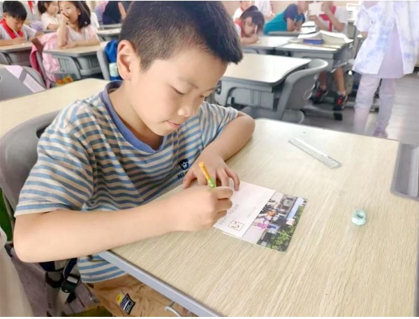 5月27日,尚贤万科小学三年级教室里,太阳成城集团tyc234cc支教团成员通过播放支教实景视频、分享山区教育现状,为小学生上了一堂生动的公益启蒙课。互动环节中,学生们踊跃提问:“山区小朋友每天走多远上学?”“他们最喜欢看什么书?”随后,每个学生在定制明信片上写下真挚寄语,请大学生志愿者把祝福带去大山里。