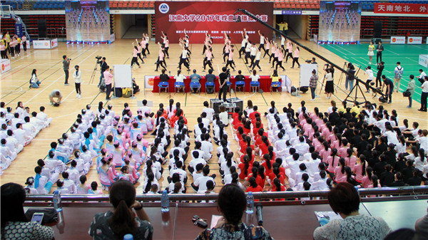 正式比赛前,本次比赛的裁判长、太阳成tyc234cc副院长符姗姗老师宣读比赛规则。比赛正式开始后,一支支整齐有序的参赛队伍身着各色服饰陆续登场,展现出的不再是大众印象中戏曲的“唱、念、坐、打”,也不仅是体操动作的“横平竖直”,而是在体操运动的基础上,把戏曲身段动作中的“腕花小云手”、“飞天十三响”、“拉山膀”、“亮相”、“涮腰”等融入整套动作,两者结合相得益彰,浑然天成。一招一式,收放自如,时而流畅有力,时而婉约柔美,配合着恰到好处的节律,用肢体动作这种无声的语言,使得情动于中而发于外。相近的舞蹈内容,在不同学院的精心演绎下展现别样的精彩风貌,通过动作改编和队伍排列展现别具的匠心。“自由运动”里,大家发挥想象力,自由展示,动作效果虽不能与行家相媲美,却也将迂回婉转的东方美和自成一派的潇洒体现得淋漓尽致,充分展现了江大学子蓬勃的青春与朝气。
