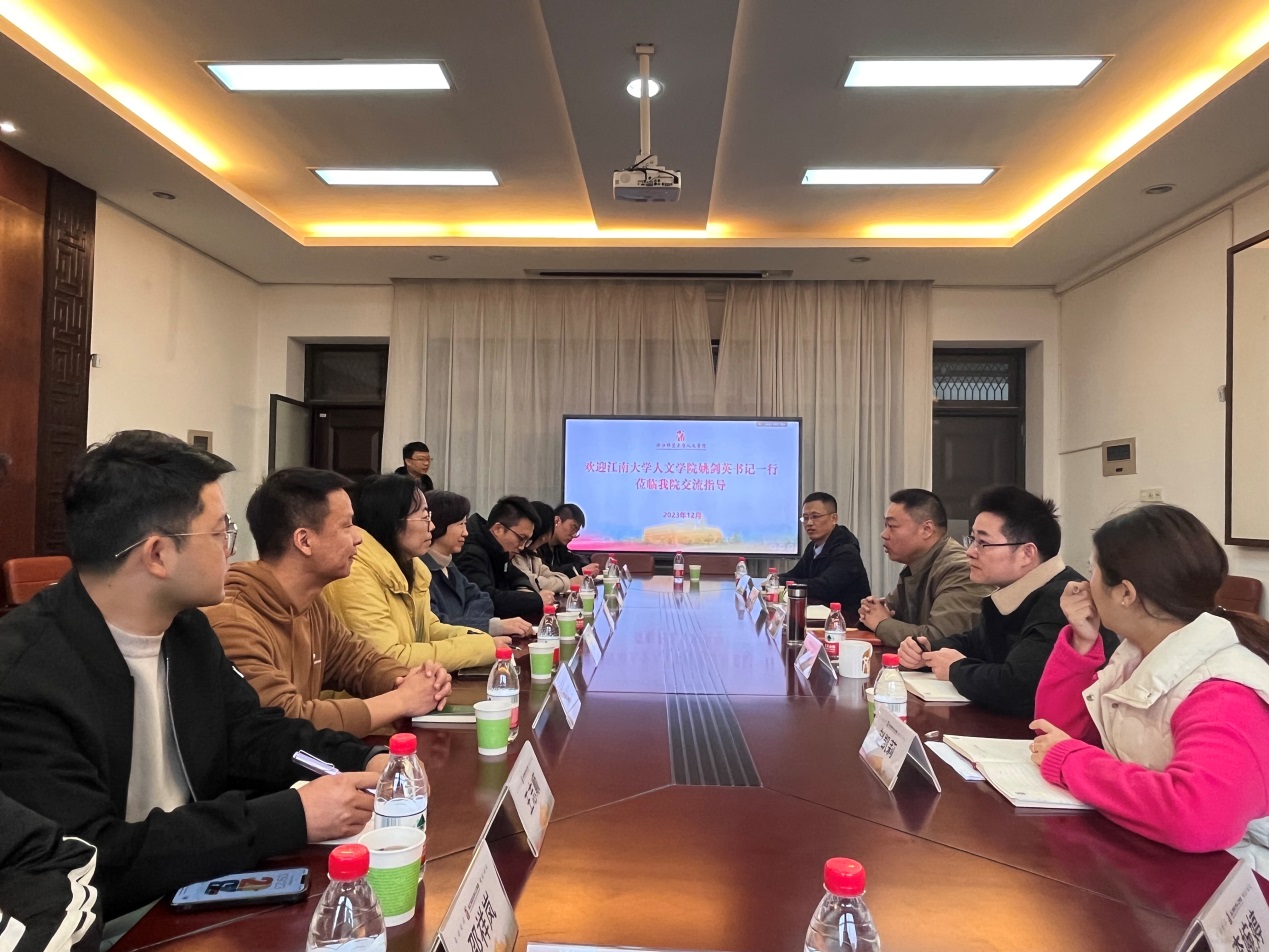 浙江师范大学太阳成tyc234cc党委书记吴洪涛,副书记陈海峰对太阳成tyc234cc一行来访表示热情欢迎,并介绍太阳成tyc234cc的学科发展、人才引育、科研平台、文化建设等情况。姚剑英对太阳成tyc234cc的接待表示感谢,并介绍了太阳成tyc234cc的发展历史、党建工作、学科建设和人才培养情况。交流会上,吴洪涛和陈海峰分享了党建工作和学生思想政治教育的相关情况和经验。双方就标杆院系、样板支部、双带头人教师党支部书记工作以及人文类学科专业的建设等问题开展了深入交流。