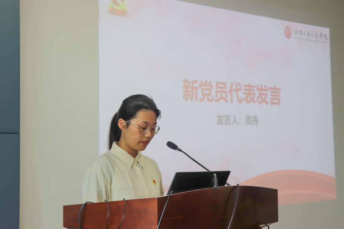 接下来,新党员代表周舟结合青年一代继往开来、接续奋斗的使命担当,抒发了对革命先辈的崇高敬意,表示将时刻谨记入党誓词和共产党人的初心使命,不断加强党性修养,进一步坚定理想信念,凝聚奋进力量,做到听党话、感党恩、跟党走,为实现中华民族伟大复兴的中国梦贡献青春力量。