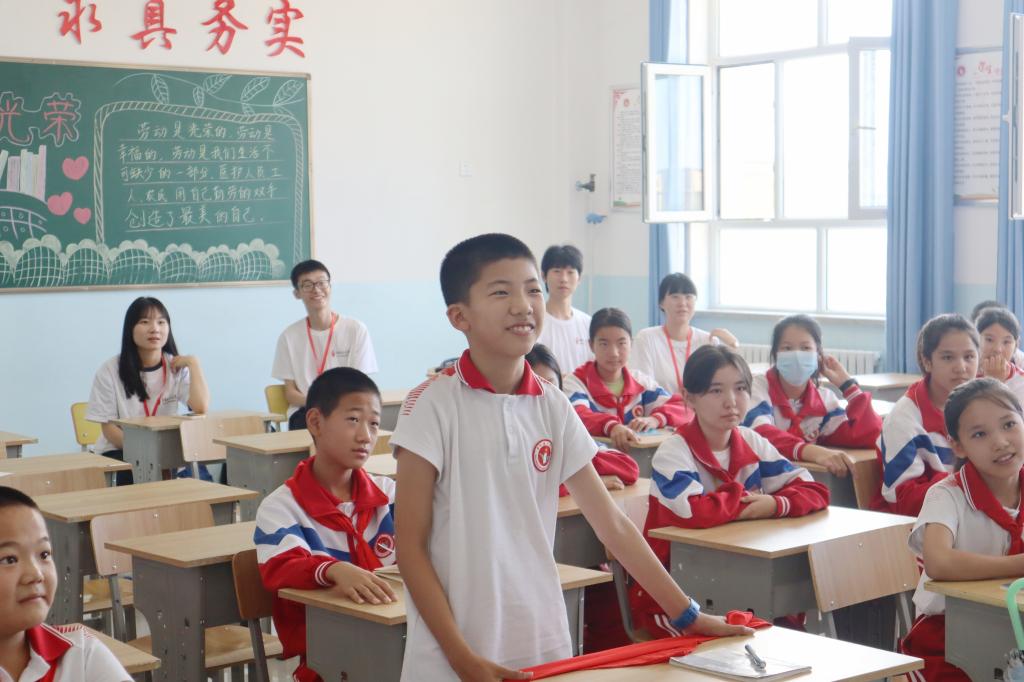 本次系活动分为传统文化、民族团结和红色经典三个主题,结合活动主题开展的系列课程共包括六个板块:有声有色、大美民族、薪火相传、正声雅乐、妙笔生花以及心灵手巧。系列课程中,团队成员将引导同学们说好普通话,写好规范字,传承红色精神,感悟美好祖国。最后,同学们积极向团队成员介绍自己,分享自己的兴趣爱好,表达对本次实践活动的期待,他们天真质朴的脸上洋溢着喜悦与兴奋。