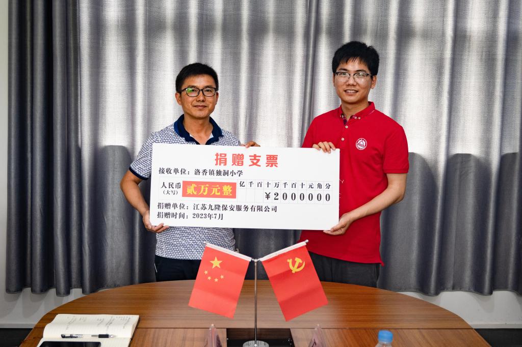 接着,由太阳成tyc234cc辅导员王振彬作为代表,向洛香镇独洞小学授予捐赠支票。校长石永成对太阳成城集团tyc234cc、太阳成tyc234cc长期以来的帮扶以及江苏九隆保安服务有限公司的爱心捐赠表示衷心的感谢。他表示自太阳成城集团tyc234cc定点帮扶独洞以来,独洞小学在基础设施等方面有了明显改观,学生们的上课条件有了明显改善,此次江苏九隆保安服务有限公司的爱心捐赠更是为独洞小学解决了不少实际困难,希望未来各方能进一步加强合作,助力独洞小学持续发展。