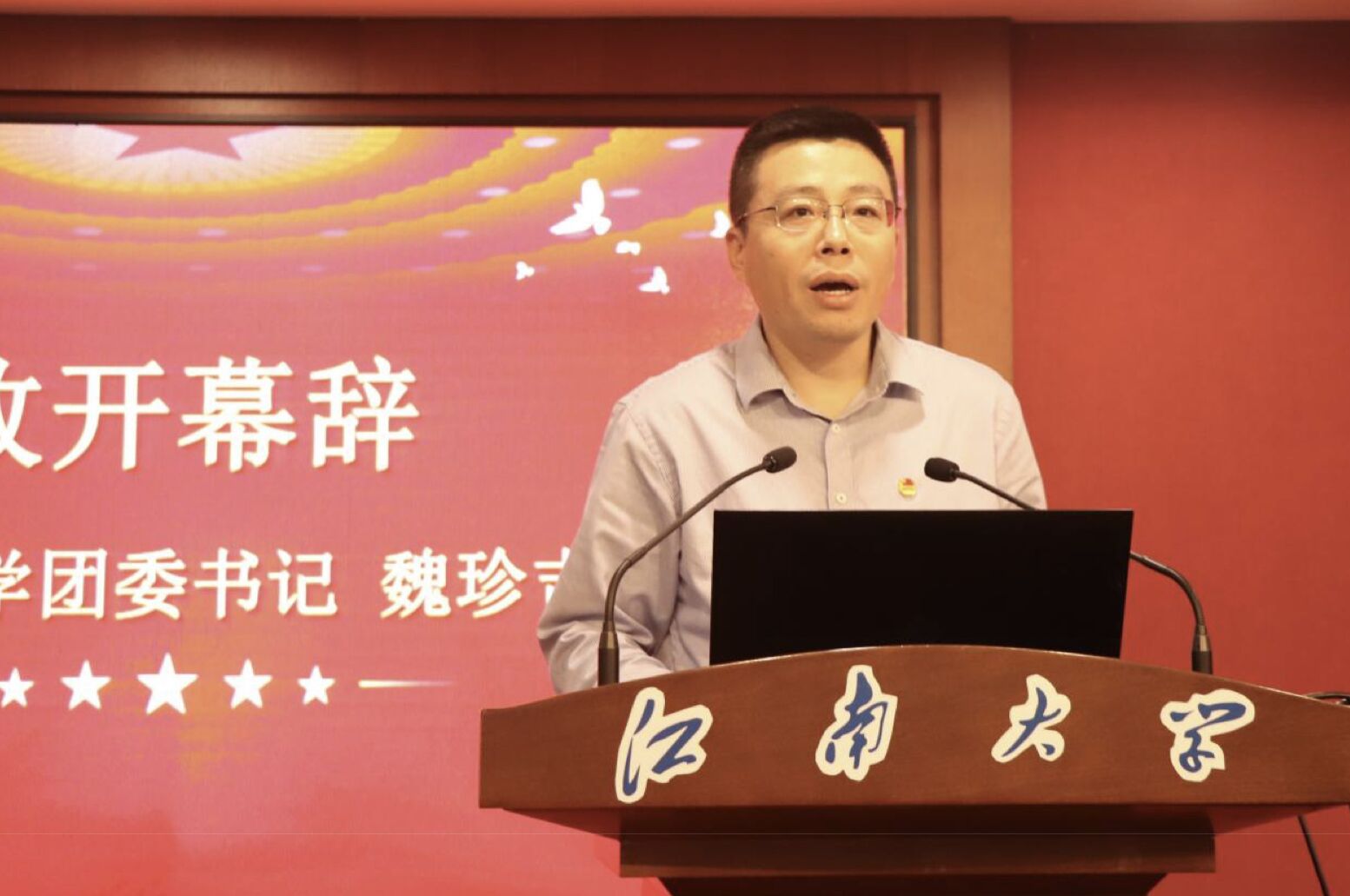 在庄严雄壮的国歌声中,大会正式开幕。魏珍吉致大会开幕辞,代表学校团委,向大会的召开表示热烈祝贺。他高度评价了人文院团学组织在学院的建设和发展上的青春贡献,他指出,我校正处于“奋发有为,跨越发展”阶段的开拓期、“奋进计划”的启动期,全体江南人必须踔厉奋进,为实现学校跻身世界一流大学建设行列的中长期愿景而不懈努力。他代表校团委向太阳成tyc234cc团学组织以及广大学生提出三点希望:一是强化思想政治引领,坚定青年理想信念;二是优化立德树人平台,服务青年成长成才;三是深化团学组织改革,凝聚青年智慧力量。
