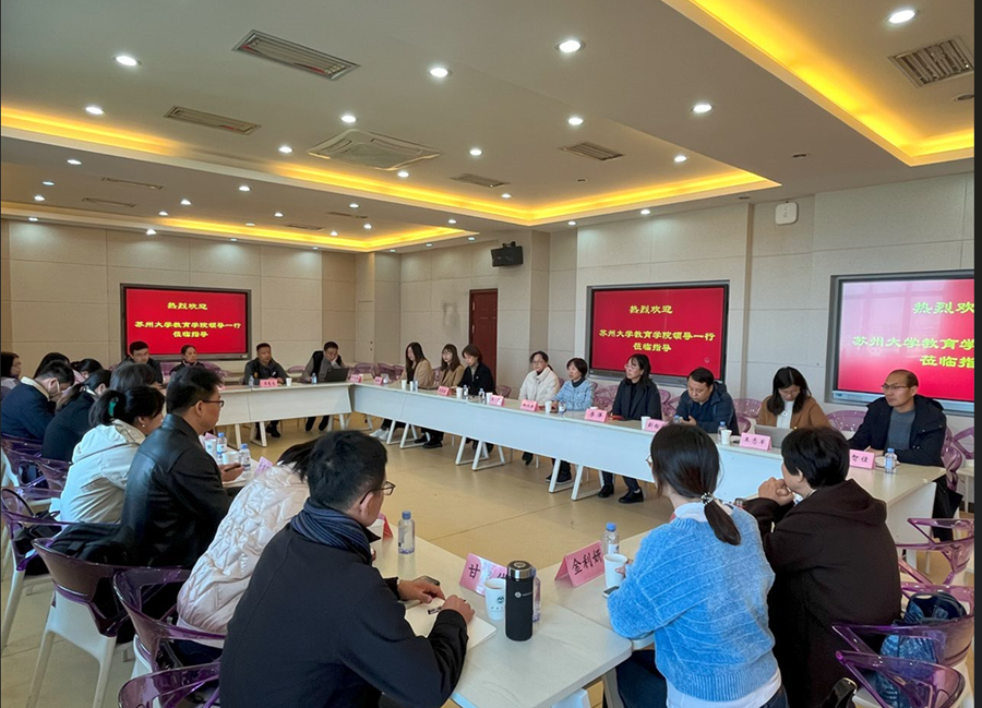 11月29日上午,苏州大学教育学院党委书记赵阳,党委副书记、副院长朱晨花携教师党支部一行到我院开展“党建引领 思政铸魂”联合党日活动。学院党委书记姚剑英,党委副书记、副院长李萍,副院长马志强,行政党支部书记胡智丹及教育技术系党员代表参加了座谈交流。活动由教技系教工党支部书记王萌主持。