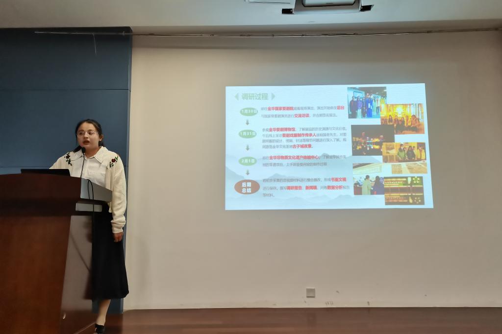 经学生自主申报、学院初评,共有3支团队、10名个人以及4个团支部进入到答辩环节。申报优秀团队的三个项目涉及“一起云支教”、“党的二十大精神宣讲”以及“行知调研”专题。其中,章驰宁同学带领的“星火相传”小队进入舟山市第一初级中学,向中学生进行党的二十大精神以及共青团史的宣讲;“江南遗梦”实践团展示了他们在浙江金华对婺剧进行实地考察,通过走访交流、问卷调查等形式了解婺剧这一中国非物质文化遗产的传承和保护现状,并为未来婺剧的传承和发扬提出可行性建议。
