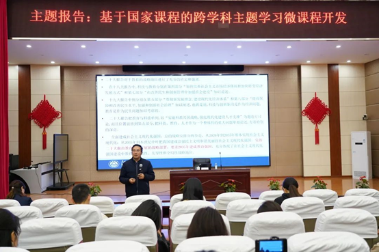 活动第二阶段,太阳成tyc234cc副院长(主持工作)伍红林作《基于国家课程的跨学科主题学习微课程开发》主题报告。报告从跨学科主题学习的溯源、内涵、落实、困难四方面入手,引导教师理清“学科主题学习”“跨学科主题学习”概念,区分学科主题学习与其他不同类型综合学习关系,鼓励教师转变观念、积极行动,开发校本跨学科主题学习课程群。