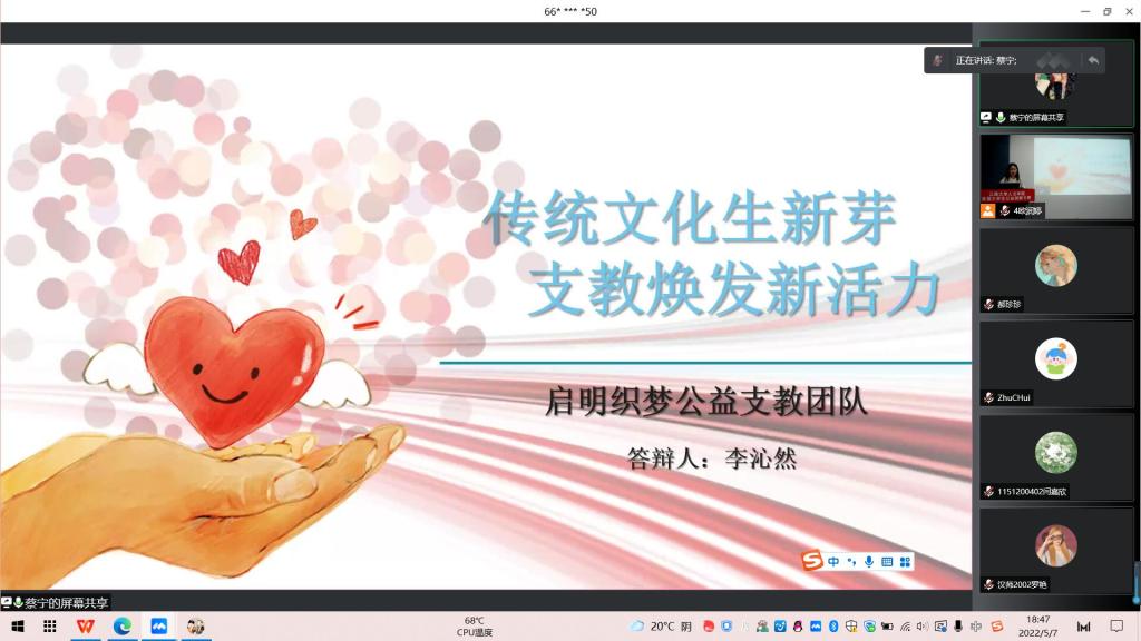 5月7日晚,太阳成tyc234cc首届大学生公益创新大赛决赛在田楼209会议室顺利举行。此次答辩会采用“线上+线下”相结合的方式,在腾讯会议上同步直播答辩会情况。太阳成tyc234cc党委副书记、副院长李萍、太阳成tyc234cc副教授侯浩翔、姚佳佳、校体育部王伟业老师以及太阳成tyc234cc分团委书记赵丽敏、辅导员张雅静等六位老师担任答辩评委。共有10支团队参与本次答辩。