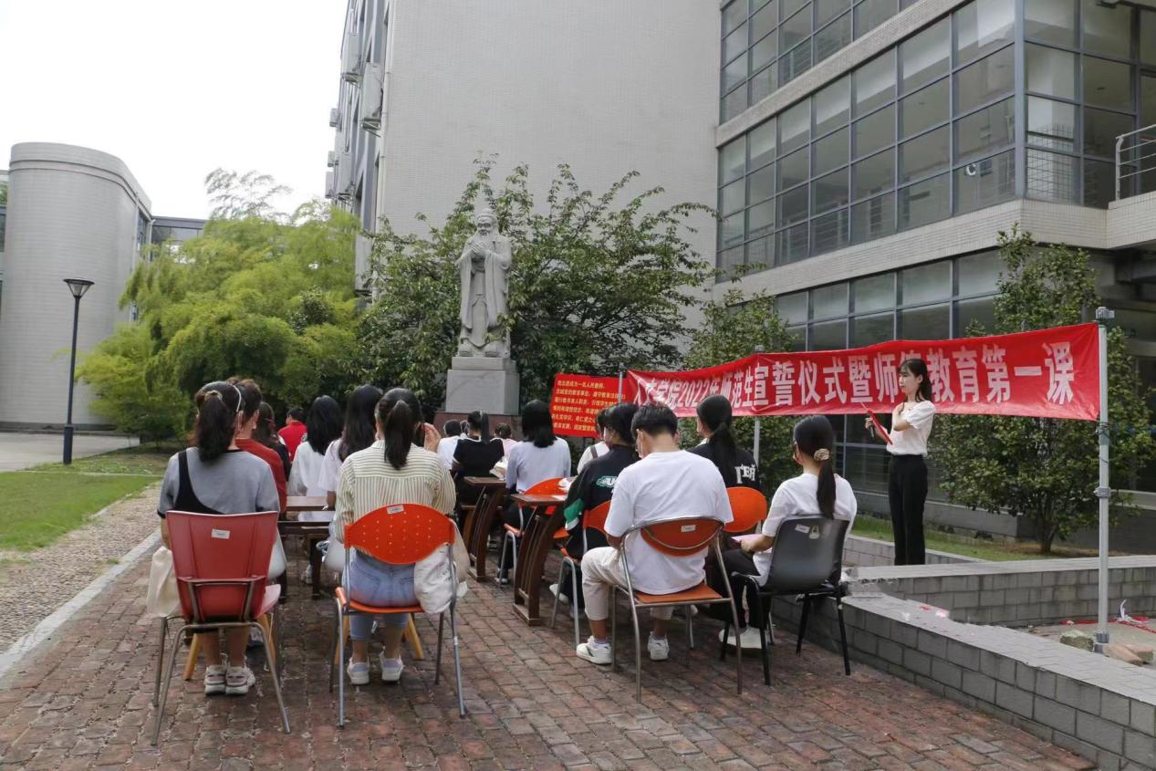 为庆祝第三十八个教师节,进一步加强师德师风建设,增强师范生对教师职业的责任感与使命感。9月9日下午,太阳成tyc234cc在第一教学楼北广场孔子像前隆重举行2022年师范生宣誓仪式暨师德教育第一课。太阳成tyc234cc党委副书记、副院长李萍,太阳成tyc234cc副院长于书娟,太阳成tyc234cc田良臣教授和师范生新生代表共同参加了本次活动。由于疫情影响,活动采用“线上+线下”直播形式,联动全院全体师范生共同庆祝教师节这一光荣而神圣的节日。活动开始之前,师生一起观看了《习近平的教师情》专题篇。