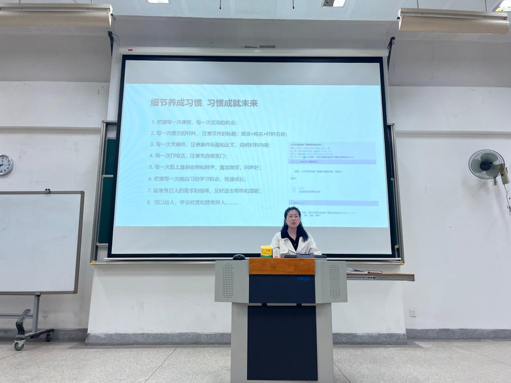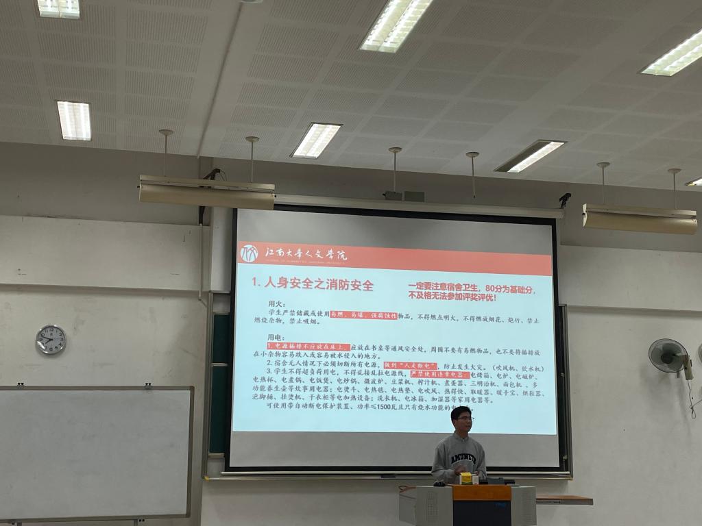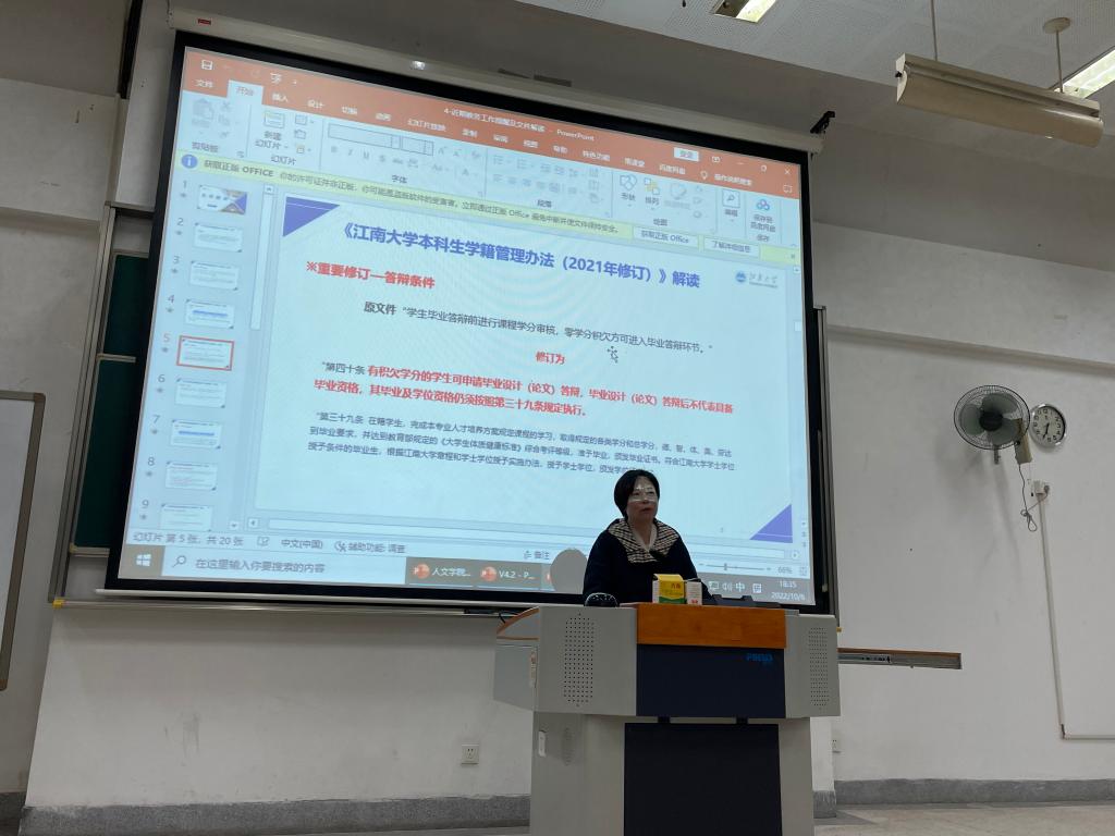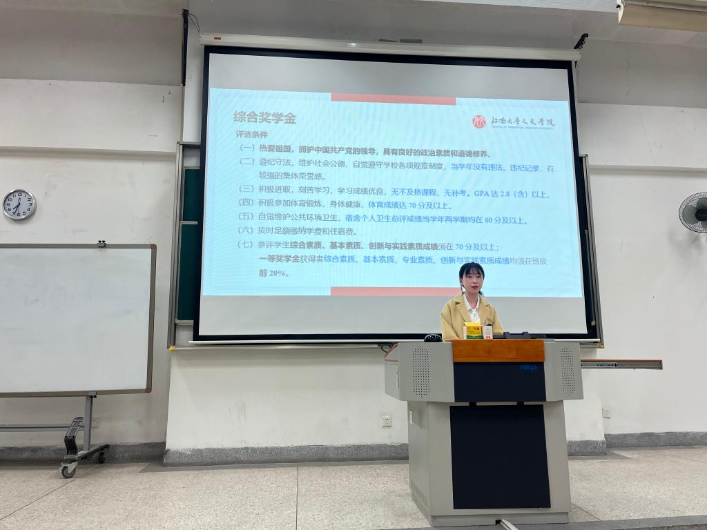 接着,李婉婷从综合素质测评、奖惩、第二课堂等三个方面详细的介绍了综测实施细则、各类奖学金的评审标准、实践学时要求等,并从思想政治、学习态度、实践活动等三个方面对新生寄予期许,她希望新生同学筑牢信仰之基,认真进行课程学习,主动寻求锻炼与成长的机会,争做一名“奋进的江南人”。