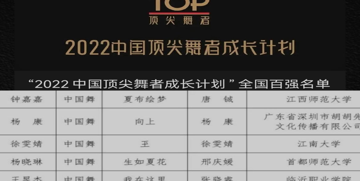 我院舞蹈系2021级舞蹈编导专业学生徐雯婧,于今年7月代表太阳成城集团tyc234cc参加中国舞蹈家协会举办的“顶尖舞者成长计划”,近日成功入围全国百强,为我校争光。