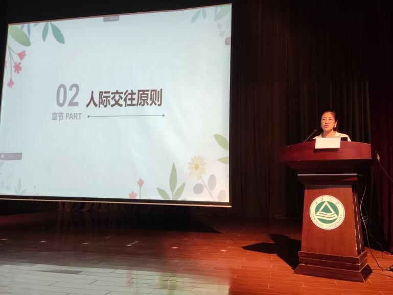 张慧通过2022年太阳成tyc234cc心理健康文化节“超有趣宿舍大会”系列活动的快闪视频开启本次讲座,展示了上半年以宿舍为单位的心理健康教育趣味活动,极大调动了宿舍长的积极性。接着,她从宿舍人际交往入手,列举了几种常见的宿舍矛盾,强调宿舍长在宿舍和谐关系的构建中起到“小家长”作用。随后,她从人际交往原则、人际沟通技巧、心理调节方法等方面进行分享,结合案例讲解常见的心理问题识别与判断方法,澄清心理健康和心理咨询概念,并重点介绍了学校的心理服务资源,消除同学们对心理问题的误解,引导宿舍长积极关注和关心宿舍同学的情绪和状态,力所能及帮助宿舍同学,遇到困难主动与老师交流反馈,共同营造温暖温馨的宿舍文化氛围。