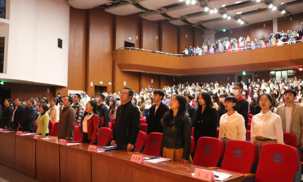在庄严的国歌声中,典礼拉开序幕。党委书记姚剑英致辞对新生表示欢迎并介绍学校及学院情况。她在发言中强调,目标越远大,视野越开阔,行动越扎实,大学就越有价值。对此,她向新生提出三点建议:一是要胸怀梦想、志存高远,每一代人都有每一代人的使命与担当,不断开拓胸襟和视野,提高格局和高度,将自己的理想与伟大的中国梦相结合。二是要学会学习,善于学习。要充分利用资源努力学习科学知识,多参与实践活动、志愿服务,培养独立思考的能力。三是要知行合一,脚踏实地。要常怀感恩之心、敬畏之心、奉献之心,多为他人和集体着想。最后,姚书记衷心祝愿2021级全体新生拥有美好无憾的大学生活,让人文照亮未来。