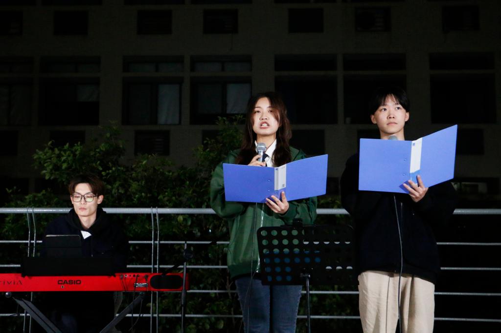 在本次演出致敬医护人员环节中,黄泳骐与徐坤同学共同朗诵了小教2003班刘晓媛同学为此次音乐会特地创作的诗歌《想什么》,向那些坚守在抗击疫情一线的医护人员献上最真挚的感谢与敬意。学生代表将汉师2001班李明洋同学精心创作的医护人员抗疫工作场景漫画作品和鲜花,献给在场的校医护人员代表,感谢他们的坚守与奉献。本次音乐会也邀请到了校医院院长、后勤保障系统党委书记叶军与我们分享疫情防控工作中的主要工作内容与感人故事。通过倾听校医院叶军的讲述,同学们深深地感受到了疫情防控工作的严峻与医护人员的艰辛。随后,同学们和医护人员共同演唱了《明天会更好》,将对未来的美好祝愿寄托于歌声。