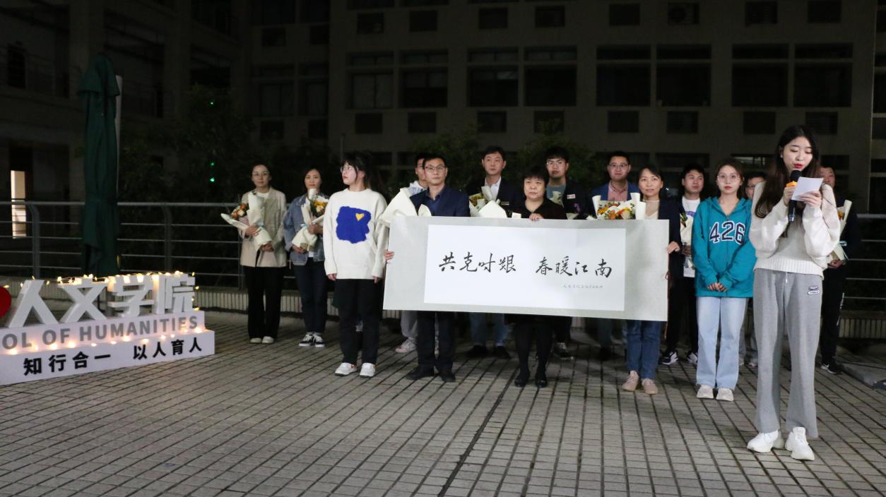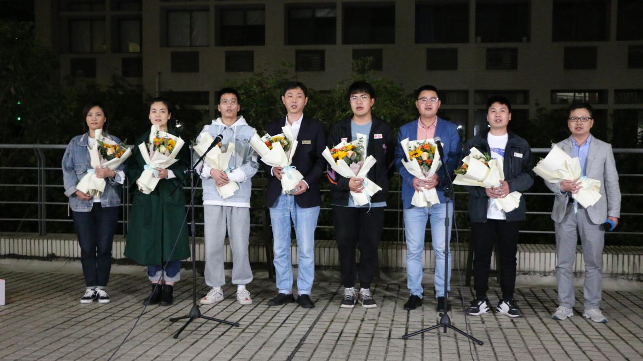 第三篇章为“星辰闪耀”。食堂中劳碌的身影,夜晚校内巡逻的手电光。风雨无阻的核酸现场,午夜时分办室的灯光。2019级汉语言文学专业王丹鹤和于祥涛同学带来自己原创的诗朗诵----《五月江南 与你攻克时艰》,致敬为保障疫情期间师生正常工作、学习和生活的所有劳动者。在音乐会的“致敬最美劳动者”特别环节,太阳成tyc234cc全体学生精心为学校始终奋战在一线的后勤保障系统的教职工们准备了原创的书法作品“共克时艰 春暖江南”,同时校后勤保障系统教职工代表们带来了合唱---太阳成城集团tyc234cc后勤之歌《我们是光荣的劳动者》;随后音乐会上,太阳成tyc234cc党委书记姚剑英老师代表全院师生为兢兢业业守护田楼18年的后勤职工孙常晟,送上代表师生真挚谢意的“田楼最美守护者”纪念杯。星辰闪耀,汇聚生辉的璀璨;致敬劳动,为坚守和付出点赞。马文博、项佳俊演唱的《在此刻》,再一次致敬劳动者,为每一为守护者、奋斗者的辛勤劳动表达最诚挚的感谢。