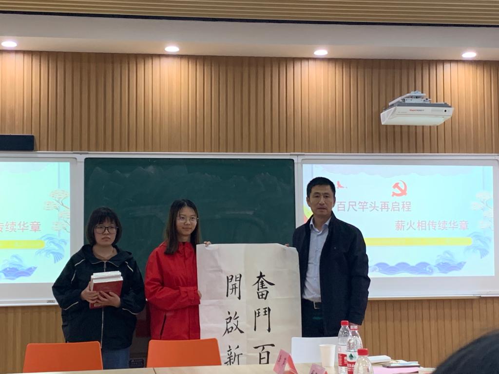 活动最后,蔡凤宇同学向戴月波送上自己的“奋斗百年路 启航新征程”书法作品,戴月波向班级赠送《红星照耀中国》《百年党史关键词》等红色书籍,勉励同学们继续学习党史,传承革命精神。