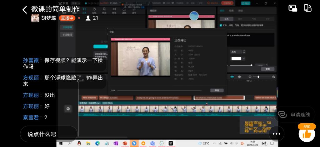 “我们采用线上教学的方式教授信息技术,让教师在沉浸式体验中进行技术学习,于做中学。”相比线下面对面授课,针对信息技术的教学内容采用线上教学的授课形式有其特有的优势。一方面,教师在使用网课软件进行听课、交流、传输文件、提交作业的过程中可以熟悉软件操作,打破对信息化环境的陌生感;另一方面,实践团成员通过屏幕共享进行操作演示,将教学资源放置课程群内共享,整理课程直播录像供教师课后复习回看,充分利用技术优势助力提高教学质量。