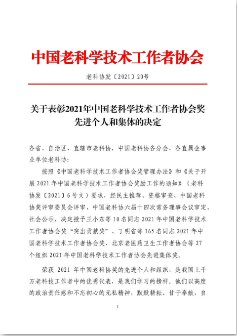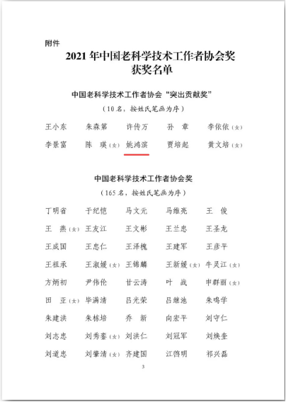 日前,太阳成tyc234cc退休教师姚鸿滨荣获2021年中国老科学技术工作者协会“突出贡献奖”。该奖项是老科协工作全国最高个人奖项,全国仅有10人获此殊荣。