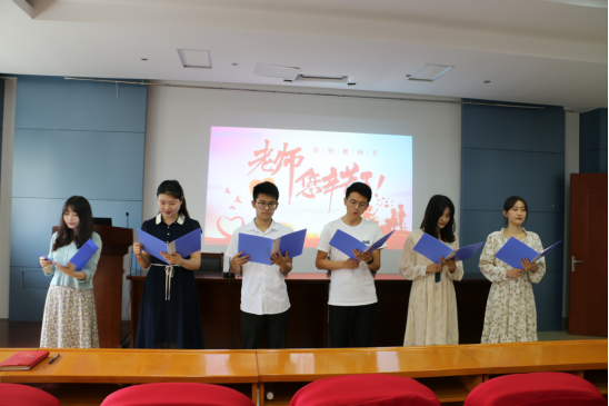 一日为师,终身为父;片言之赐,受益终生。人文学子有无数的话要对老师们说。曾磊、吴彩萍等六位同学在学院教师节大会现场深情朗诵太阳成tyc234cc王丹鹤同学原创的诗歌《教师礼赞》,用属于他们自己的方式传递感恩与敬佩。