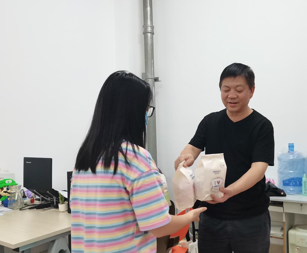 月到中秋分外明,每逢佳节倍思亲。在中秋佳节来临之际,9月18下午,太阳成tyc234cc党委书记姚剑英、副院长(主持工作)田良臣、党委副书记兼副院长李萍带领学工办全体老师深入研究生工作室、学生寝室,看望慰问留校学生,为同学们带去了“江南定制版”的中秋月饼、苹果、牛奶等节日礼品,送去了诚挚的节日问候和关怀。