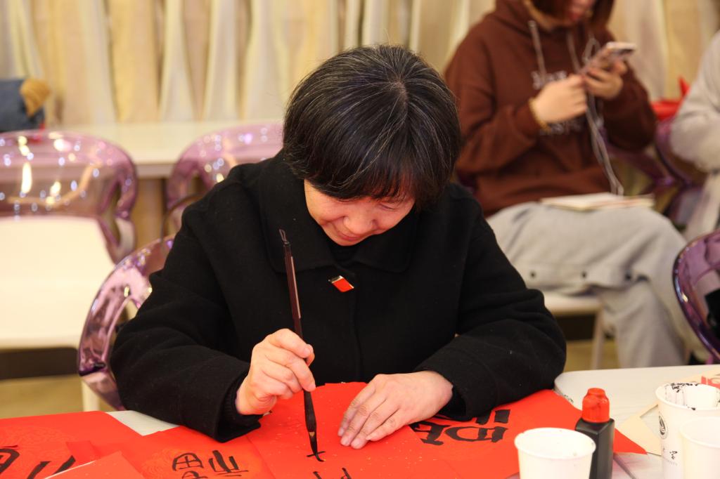 同学们紧随其后,提笔、蘸墨、挥笔、收笔。一张张红纸,一个个或灵巧、后大气、或质朴的福字,展示着新春如意,满满福气!书法爱好者王彦舒喜悦地表示道:今天又收获了很多书法秘诀,也让自己对书法的热爱更加深刻。